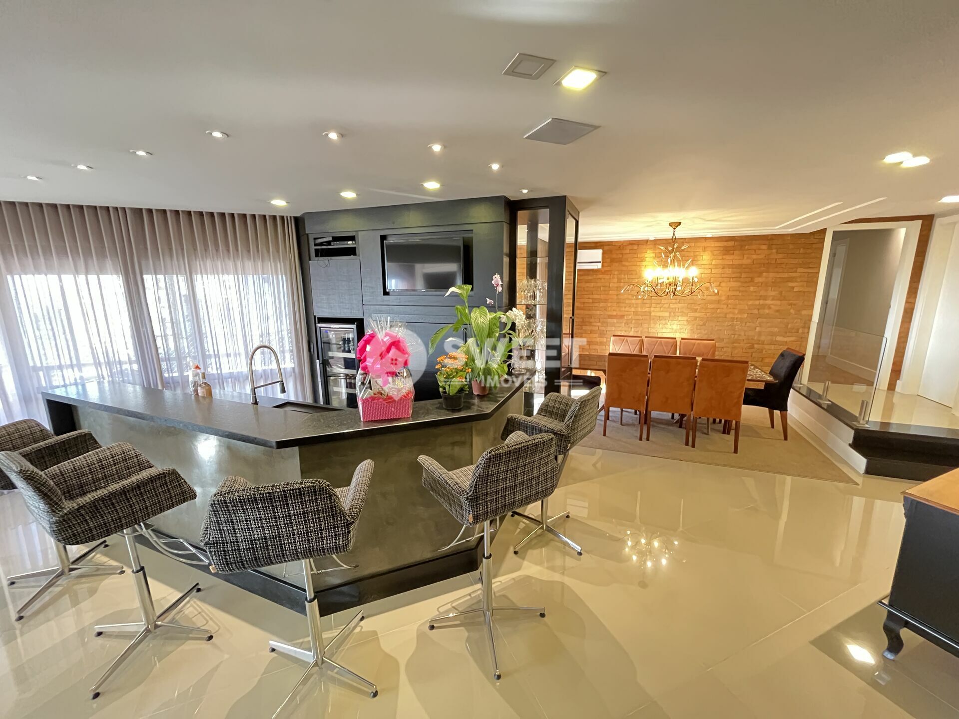 Um dos apartamentos mais exclusivos da cidade, somente 1 por andar com hall privativo, conta com uma imensa área comum, onde integra sala de tv, sala de estar, gourmet privativo com acesso a sacada e sala de jantar, conta com área de Office, ampla cozinha com vista panorâmica e lavanderia.