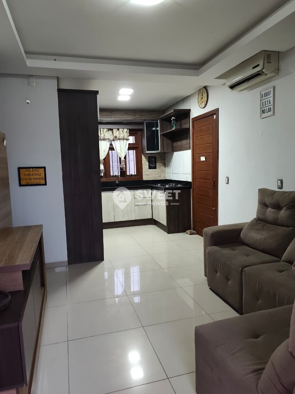 Ficam no imóvel: cozinha, dois ar-condicionados de 12.000 BTUs, sofá, fogão, fornos, cooktop e armários.